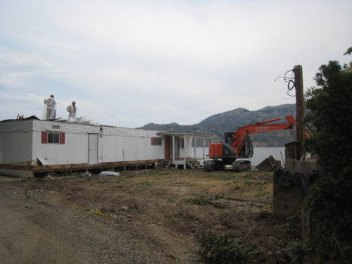 In June, the RDOS variance board approved our application for a floodplain exemption. However they required that a covenant protecting them from any damages that may result from flooding affecting our property be registered against the North Beach Estate property. This required an RDOS lawyer to write up the covenant, a surveyor to produce a plan which showed the area of the covenant, the North Beach Estates lawyer to review the covenant, and the NBE board members to review and then sign the covenant. The covenant was returned to the RDOS for signatures by the appropriate people and then sent back to the lawyer to submit the covenant to be registered by the Land Titles Office. Then FINALLY the proof of registration was sent back to RDOS so that now they could move forward with our building permit application. Since it appeared that the building permit was very likely to be granted (only some things on our side now needed), we started to proceed with the demolition of the original buildings.