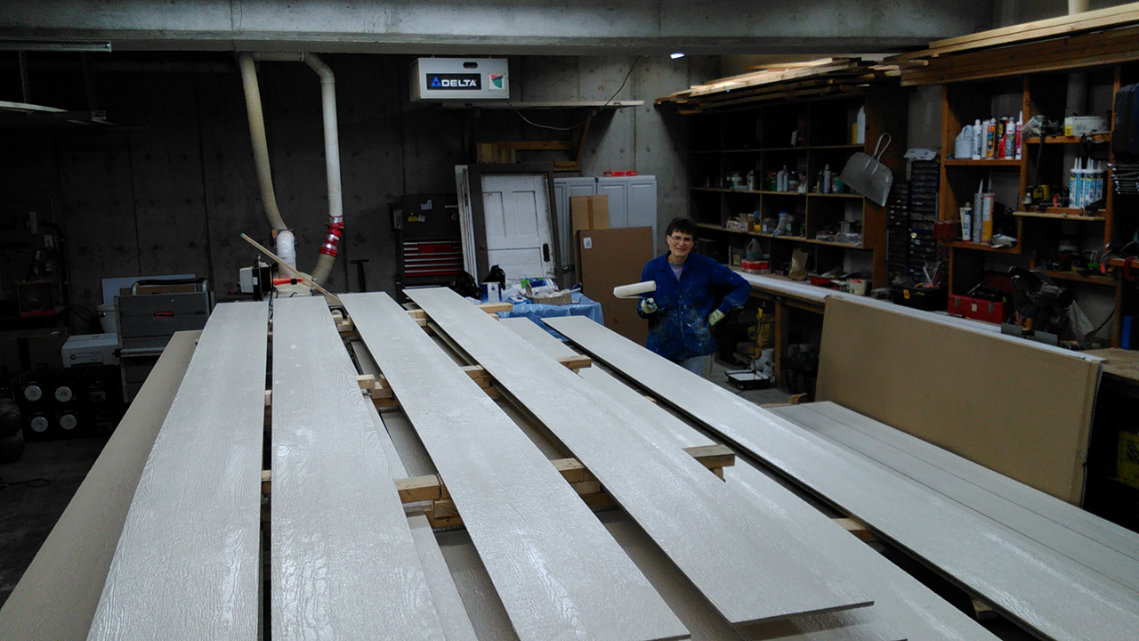 We spent much of the last 3 days in our builder’s huge workshop painting the trim and fascia boards. Here is Joyce just finishing up her last board.