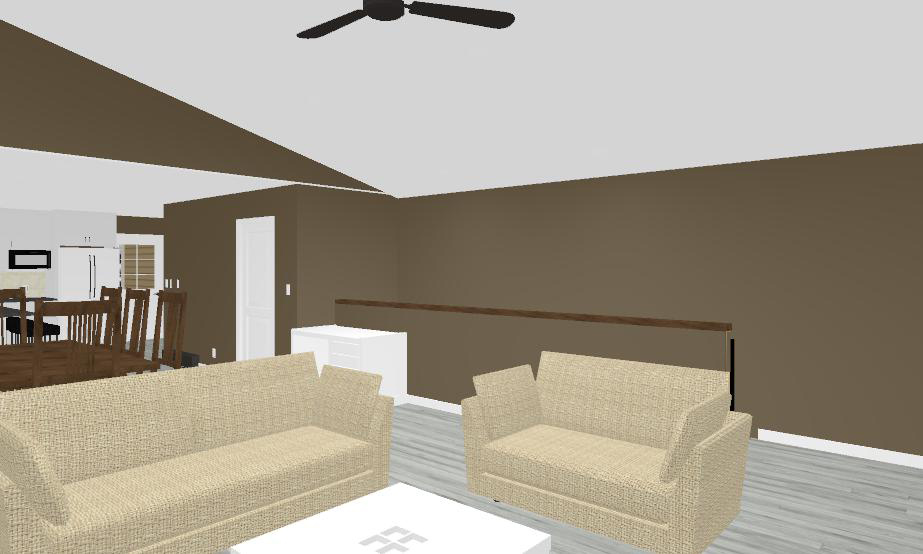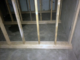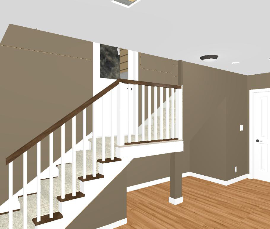 We had much discussion about the stairs going between floors. Our builder suggested that using a half wall instead of railings would be less expensive. We decided on putting a half across the stair opening in the great room and putting a wall along the side of the upper section of the stairs instead of railings as we had originally planned. There will be railings on the landing and lower section of stairs. See pictures below.